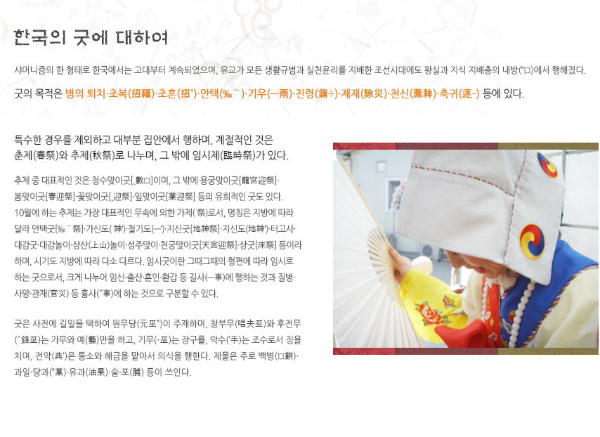 한국의 굿에 대하여 : 샤머니즘의 한 형태로 한국에서는 고대부터 계속되었으며, 유교가 모든 생활규범과 실천윤리를 지배한 조선시대에도 왕실과 지식 지배층의 내방(內房)에서 행해졌다. 굿의 목적은 병의 퇴치·초복(招福)·초혼(招魂)·안택(安宅)·기우(祈雨)·진령(鎭靈)·제재(除災)·천신(薦神)·축귀(逐鬼) 등에 있다. 특수한 경우를 제외하고 대부분 집안에서 행하며, 계절적인 것은 춘제(春祭)와 추제(秋祭)로 나누며, 그 밖에 임시제(臨時祭)가 있다. 추제 중 대표적인 것은 청수맞이굿[橫數防]이며, 그 밖에 용궁맞이굿[龍宮迎祭]·봄맞이굿[春迎祭]·꽃맞이굿[花迎祭]·잎맞이굿[葉迎祭] 등의 유희적인 굿도 있다. 10월에 하는 추제는 가장 대표적인 무속에 의한 가제(家祭)로서, 명칭은 지방에 따라 달라 안택굿[安宅祭]·가신도(家神禱)·철기도(祈禱)·지신굿[地神祭]·지신도(地神禱)·터고사·대감굿·대감놀이·상산(上山)놀이·성주맞이·천궁맞이굿[天宮迎祭]·상굿[床祭] 등이라 하며, 시기도 지방에 따라 다소 다르다. 임시굿이란 그때그때의 형편에 따라 임시로 하는 굿으로서, 크게 나누어 임신·출산·혼인·환갑 등 길사(吉事)에 행하는 것과 질병·사망·관재(官災) 등 흉사(凶事)에 하는 것으로 구분할 수 있다. 굿은 사전에 길일을 택하여 원무당(元巫堂)이 주재하며, 창부무(唱夫巫)와 후전무(後錢巫)는 가무와 예(藝)만을 하고, 기무(技巫)는 장구를, 악수(樂手)는 조수로서 징을 치며, 전악(典樂)은 퉁소와 해금을 맡아서 의식을 행한다. 제물은 주로 백병(白餠)·과일·당과(糖菓)·유과(油果)·술·포(脯) 등이 쓰인다.