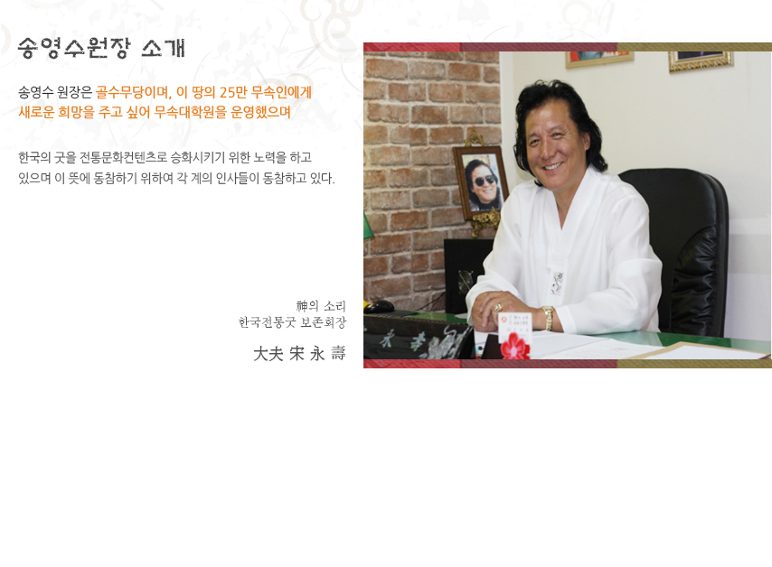 송명수원장 소개 : 송영수 원장은 골수무당이며, 이 땅의 25만 무속인에게 새로운 희망을 주고 싶어 무속대학원을 운영했으며 한국의 굿을 전통문화컨텐츠로 승화시키기 위한 노력을 하고있으며 이 뜻에 동참하기 위하여 각 계의 인사들이 동참하고 있다.